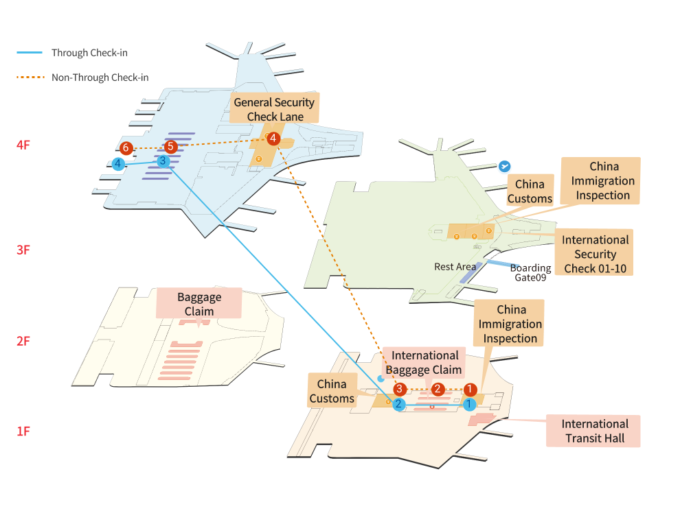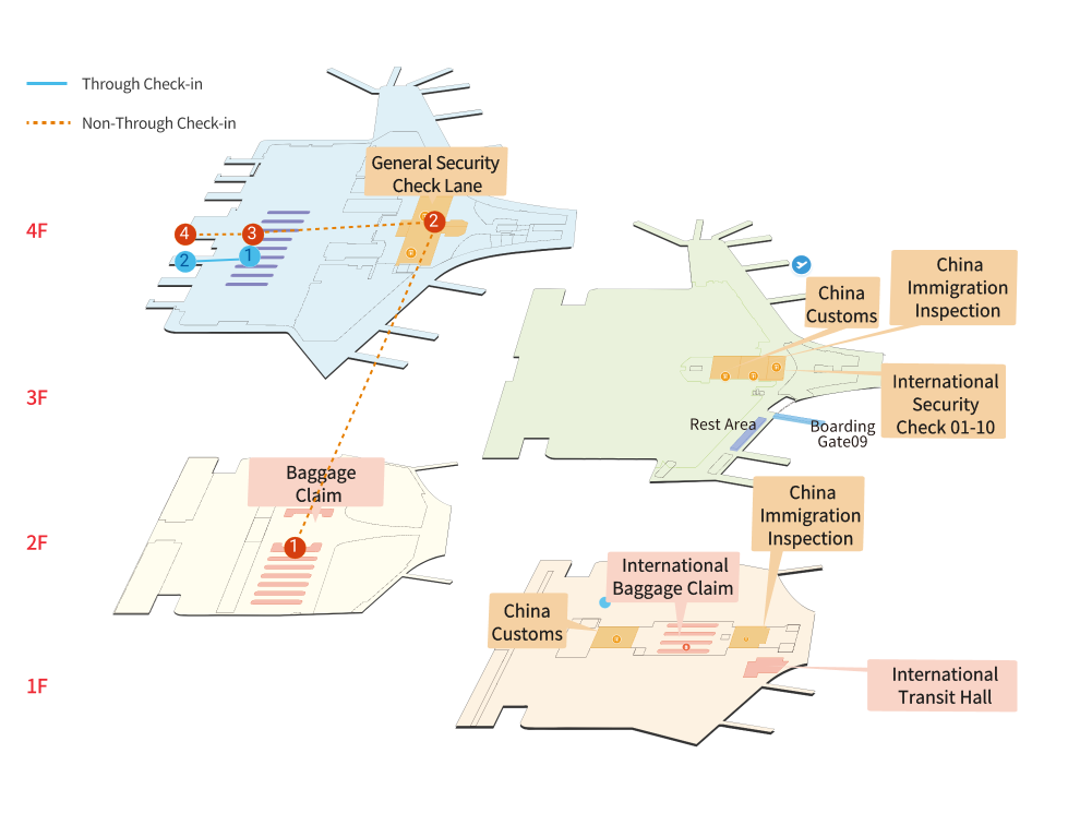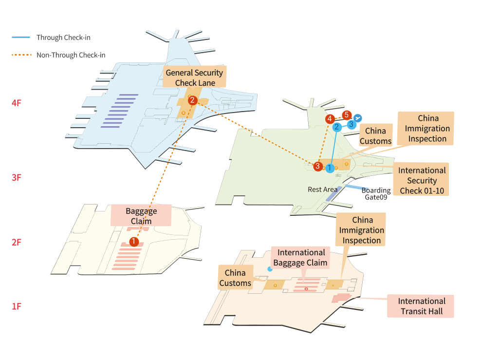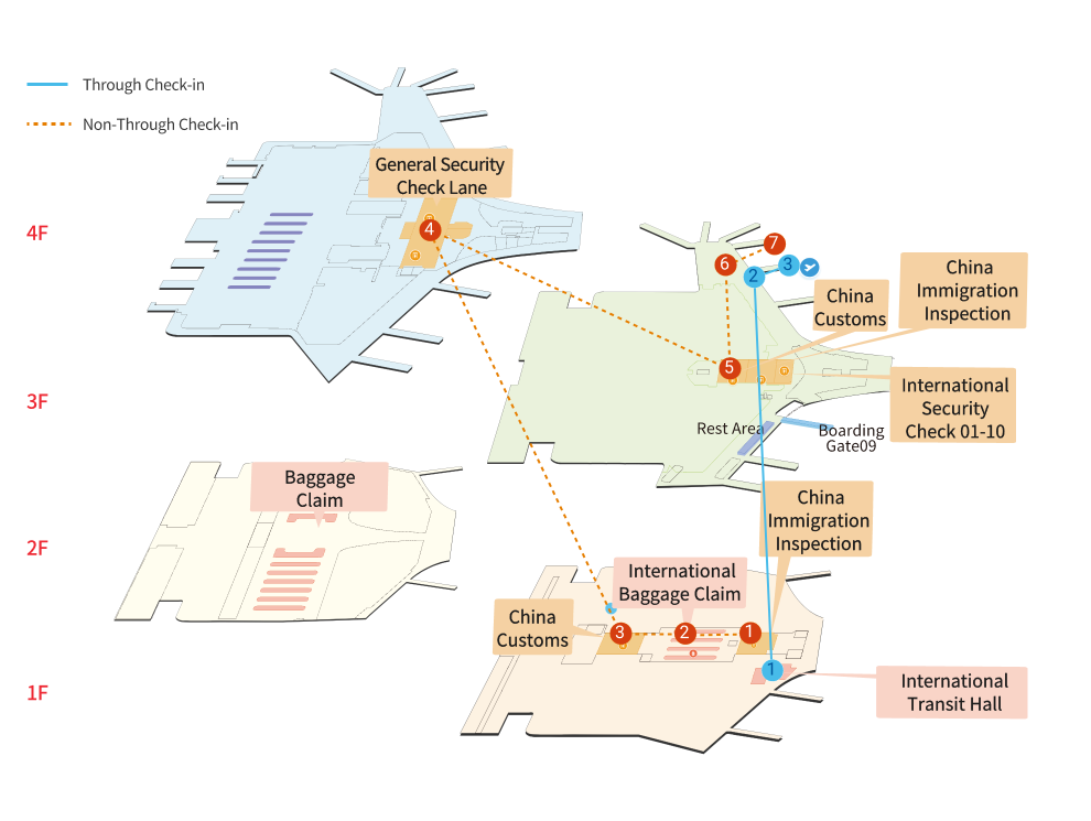 | 1.Complete entry combined inspection procedures (Immigration) at 1F, T3 | 2.Customs inspection of checked baggage and carry-on luggage | 3.Enter the domestic waiting area via the transfer passage | 4.Boarding at the gate |