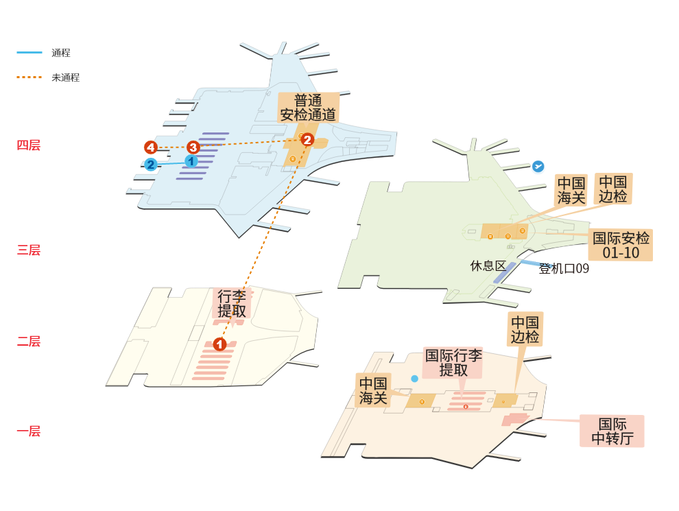 | 1.T3二层国内到达厅提取托运行李 | 2.T3四层办理乘机手续 | 3.国内候机区候机 | 4.登机口登机 |