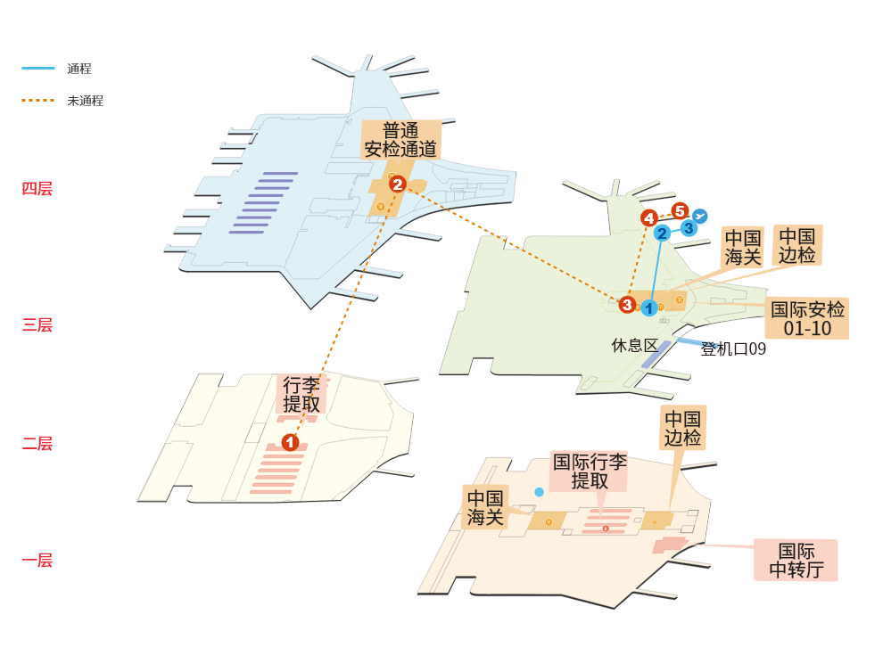 | 1.T3二层国内到达厅提取托运行李 | 2.T3四层办理乘机手续 | 3.T3三层出联检区办理手续(海关、边检、安检) |